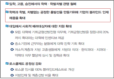 문재인 대통령은 19대 대선에서 학력과 학벌, 차별 없는 공정한 출발선을 만들기 위해 기업의 블라인드 채용을 확대하겠다고 공약하였습니다.