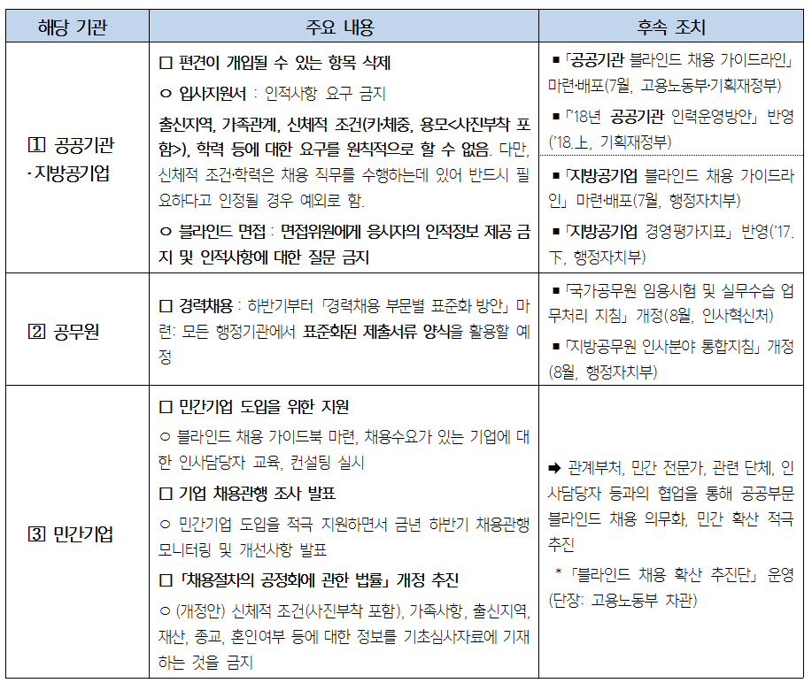 추진방안에 따르면 모든 공공기관은 하반기부터 입사지원서와 면접에서 인적사항 블라인드 의무화 조치를 이행하게 됩니다. 그리고 그 내용은 「공공기관 블라인드 채용 가이드라인」(7월), 「’18년 공공기관 인력운영방안」(’18.상반기)에 반영됩니다. 또 지방공기업의 경우, 「지방공기업 블라인드 채용 가이드라인」(7월), 「지방공기업 경영평가지표」(’17.하반기)에 반영됩니다. 또 공무원 경력채용은 「국가공무원 임용시험 및 실무수습 업무처리 지침」 개정(8월)과 「지방공무원 인사분야 통합지침」 개정(8월)을 통해 이루어집니다.
