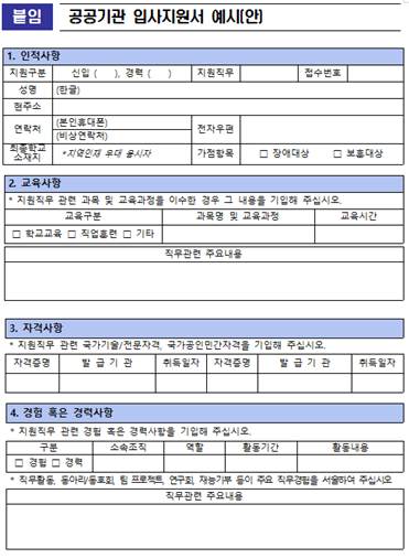 공기업은 2015년부터 NCS(국가직무능력표준) 채용을 진행하고 있지만 블라인드 채용을 모든 채용 형태에 다 적용하고 있지 않았습니다. 공채에서 블라인드 채용을 진행하더라도 비정규직 등의 계약직 채용이나 수시채용에서는 여전히 과거의 이력서를 사용하는 사례들이 발견되었습니다.