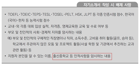 자사고나 외고의 자기주도학습전형을 보면 자기소개서, 교사추천서, 면접 복장 등에서 출신중학교나 학부모의 사회・경제적 지위를 암시하는 내용이 담겨서는 안 됩니다. 블라인드 채용에서도 이러한 전형의 형태와 안내 방법을 참고할 수 있을 것입니다.