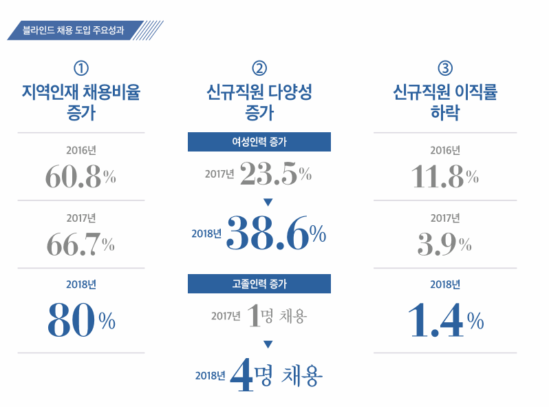 2018년 ‘FULL 블라인드 채용’을 통해 전체 선발인원의 80%를 비수도권 인재가 차지했습니다. 이는 지방대 졸업생의 경쟁력을 확인했다는 점에서 의미가 깊고, 신규직원의 다양성이 증가하였으며 무엇보다 신규직원의 이직률이 급감하여 1.4%대로 떨어진 큰 성과가 있었습니다. 특히 학벌 위주의 평가기준을 배제함으로써 지방대학 출신 인재의 진출 가능성이 커진 것은 이직율을 낮추고 우수 인재 유출을 막아 지역 발전에도 이바지할 것입니다.