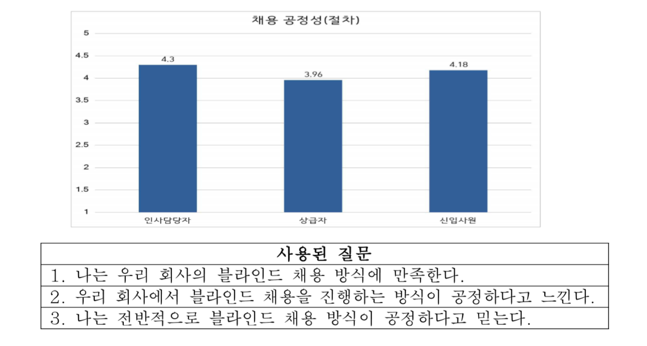 [공정성 성과]인사담당자, 상급자, 신입사원 모두 블라인드 채용 방식의 절차 및 결과에 대해 5점 만점에 3.95- 4.39점을 주어 매우 긍정적 평가. 특히 신입사원의 공정성 지각이 높을수록 직무 태도도 좋아짐.