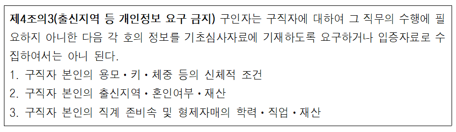 얼마 전 소위 블라인드 채용법이라 일컬어지는 “채용절차의 공정화에 관한 법률이 개정”되면서 올해부터 사용자가 구직자의 신체적 조건, 출신지역, 혼인여부, 재산, 직계 존비속 및 형제자매의 학력·직업·재산을 입사지원서나 자기소개서에 요구하거나 수집하는 것이 금지되었습니다.